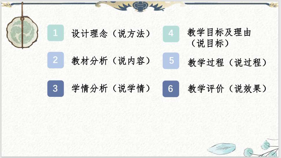 通常来说,一个完整的说课需要包括以上几部分的内容:设计理念、教材分析、学情分析、教学目标及重难点、教学过程以及教学评价, 即说理念+说目标+说内容+说方法+说过程+说评价反思