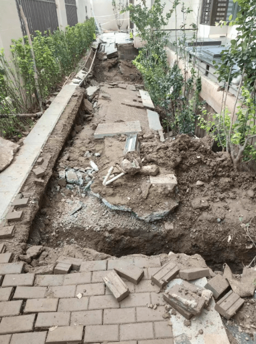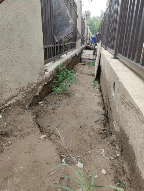 在一栋楼外,有隔离围挡,围挡上的温馨提示写着:“路面塌陷,禁止通行。”塌陷的路面,紧挨着一楼的窗户和天井,面积大约有20平方米。这种塌陷,记者还在另一栋楼前看到。略有不同的是,另一处塌陷,已经有维修人员在进行修补。