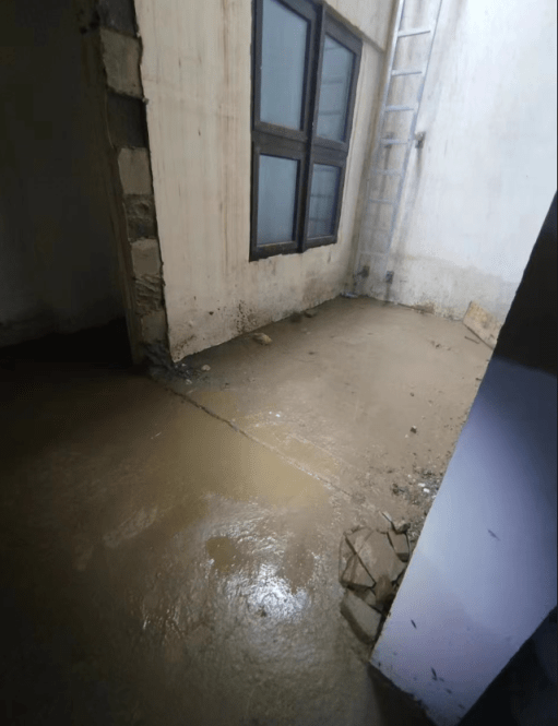 冯建把记者带到地下室,房间基本已经装修完毕,但是经过雨水的浸泡,地砖上有泥沙,落地橱柜上有水印,卫生间的排污管井里还有积水。房间的天花板上,有一个大洞。大洞下方,放着一个平时小区里摆放的大垃圾桶。