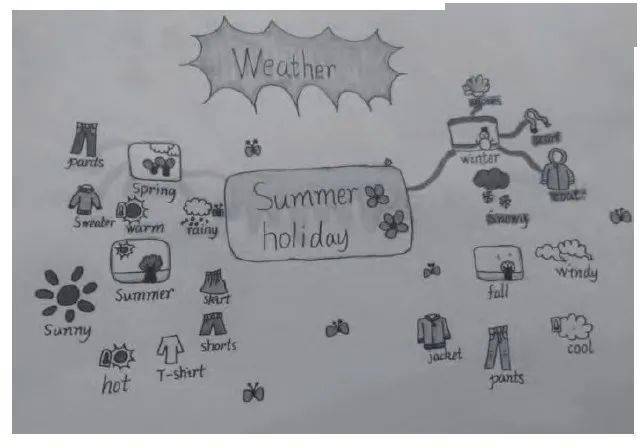 如关于 spring 这个单词,学生会想到 flowers、 birds、grass、 coat、 flying kites;关于 summer,学生会想到 skirts、hats、 swimming、 ice cream。一提到 autumn,学生会想到 climbing mountain、 jeans、 fruit。一提到 winter,许多学生就会想到 down jacket、 boots、 skiing、 snowman、dumplings。 教师可以将学生所能想到、说出的词都添加在思维导图上,让学生记住更多的单词。教师也可以发挥主动性,在学生说过单词后,补充一些新单词、新知识,使思维导图的内容更加丰富。通过思维导图这种简便的教学工具,教师可以引导学生将不同的英语词汇联系起来,帮助学生深入理解英语词汇,提高学生的英语词汇学习质量,构建高效英语课堂。