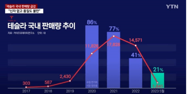 2022年,特斯拉全球销量达131万辆,而特斯拉在韩国的销量仅为14571辆,同比下降了近20%。自从2017年进入韩国市场之后,在韩国刮起一波特斯拉风潮,在2020年,特斯拉达到进口电动汽车市场占有率巅峰86%,此后逐年下降,在2023年仅剩21%。
