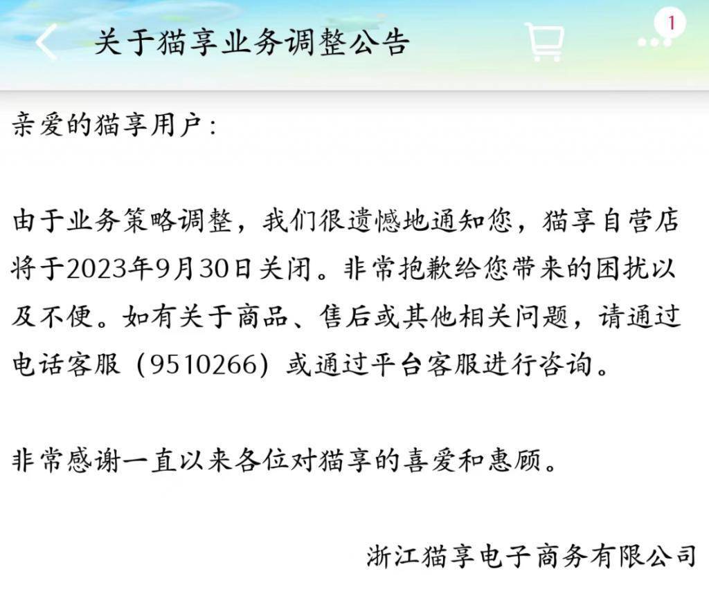 上线至今不足一年半,天猫旗下的自营业务猫享,即被按下了暂停键。近日,猫享发布业务调整公告,将于今年 9 月 30 日关闭。