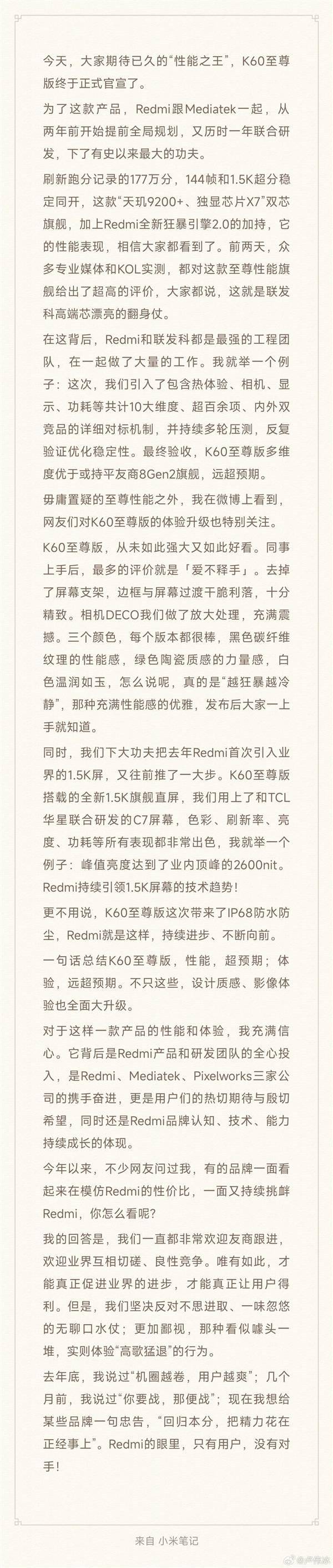 快科技8月11日消息,小米集团卢伟冰发文:为什么我敢说K60至尊版是“性能之王”?