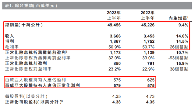 以百威亚太为例。8月3日,百威亚太发布2023年上半年财报,财报数据显示,上半年企业营收36.66亿美元,同比增长14%;正常化除息税前盈利8.5亿美元,同比增长15.9%。