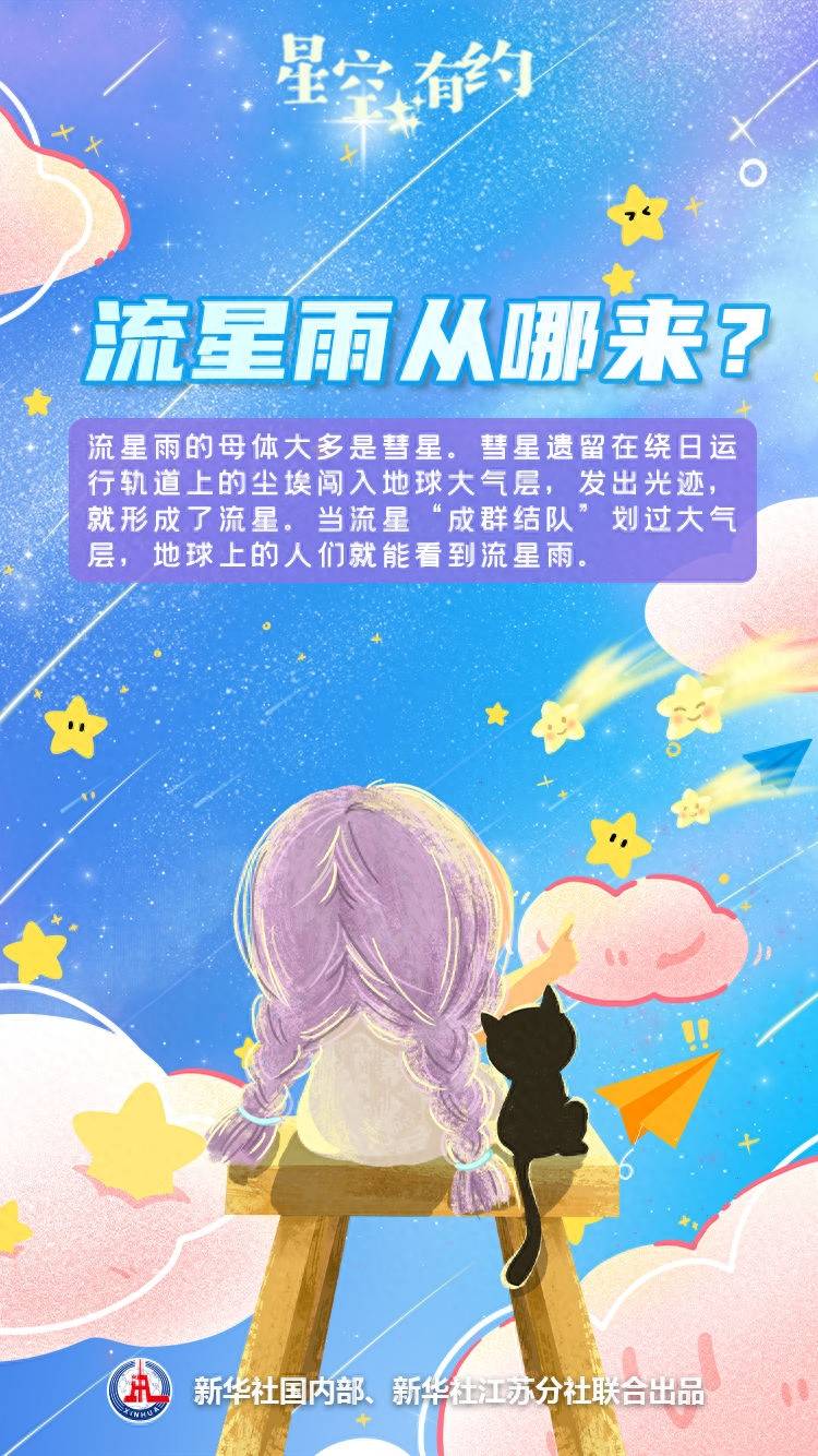 中国科学院紫金山天文台科普主管王科超说,要解释这个问题,首先得讲到流星雨产生的原因。流星雨的母体大多是彗星。彗星遗留在绕日运行轨道上的尘埃闯入地球大气层,发出光迹,就形成了流星。当流星“成群结队”划过大气层,地球上的人们就能看到流星雨。