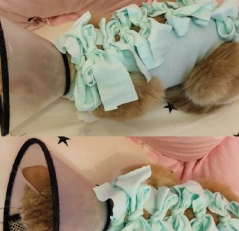 母猫做完手术后,都会穿一件小手术服,避免术后母猫舔伤口,只要伤口不沾水、保持干燥,伤口很快就能愈合啦!一般术后4天左右就可以不穿手术服了。注意检查伤口愈合的情况,如果伤口干燥,不流脓不潮湿,便可以取出敷在伤口上的纱布,然后穿上衣服,等到术后7-9天时可以拆线。