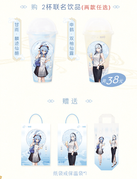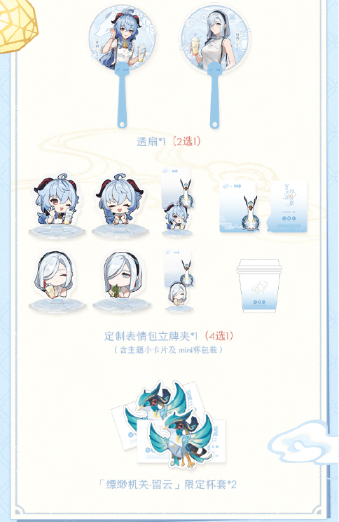 套餐内含:甘雨与申鹤的饮料(任选),纸袋或保温袋其中1个,扇子2选1,立牌夹4选1,限定杯套2个。
