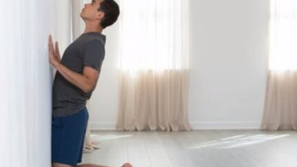 靠着墙让你的大腿完全垂直地面之后,身体前侧拉长之后再向后弯,可以靠在椅子上,这么做骆驼式也是一个很好的伸展身体前侧的一个动作,你发现我们向下向后弯的幅度并不是很大,但是这个动作它很好的去拉伸了身体的前侧。