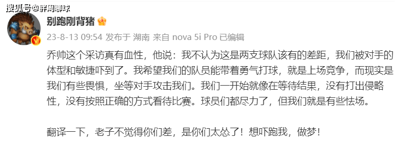 而在赛后,中国男篮主教练乔尔杰维奇在接受采访的时候谈到了球队为什么会输掉这么大的分差时,乔帅也终于说了实话,乔尔杰维奇表示:我不认为这是两支球队该有的差距,我们被对手的体型和敏捷吓到了。我希望我们的队员能带着勇气打球,就是上场竞争,而现实是我们有些畏惧,坐等对手攻击我们。我们一开始就像在等待结果,没有打出侵略性,没有按照正确的方式看待比赛。球员们都尽力了,但我们就是有些怯场。