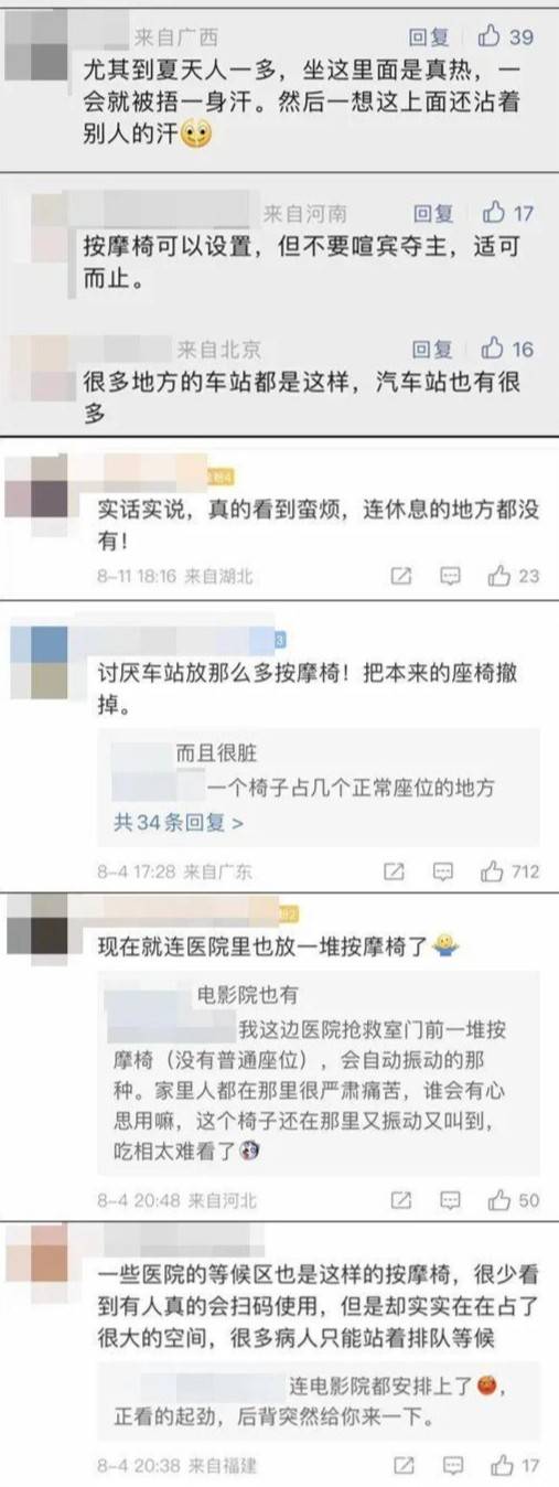 共享按摩椅存在安全隐患。日前,重庆火车西站一位女乘客的长发被卷入按摩椅,整个人动弹不得,在众人帮助下才得以脱困。而“一些按摩椅模式简单,无法调节力度”“像是花钱体验了一顿暴打”“按摩椅太脏,没人消毒清洗”的吐槽也越来越多。部分场所的共享按摩椅还设置了“防占座”功能,不断通过语音提示、变换座椅形状赶走“蹭座者”。