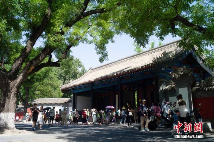 7月6日,北京,游客在树荫下排队,准备参观孔庙和国子监博物馆。中新社记者 盛佳鹏 摄