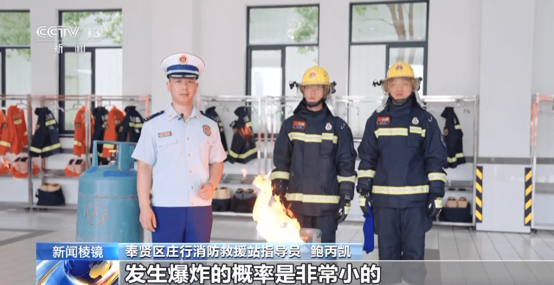 上海奉贤区庄行消防救援站指导员鲍丙凯:单个气瓶在持续稳定燃烧情况下,发生爆炸的概率是非常小的。但是要格外注意的是,钢瓶如果阀门完好,在火灾中受到明火长时间炙烤,是极易发生爆炸的。