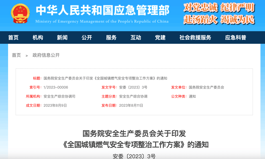 今年8月11日,应急管理部发布消息,为深刻汲取近年来城镇燃气安全重特大事故教训,全面加强城镇燃气安全风险隐患排查治理,切实保障人民群众生命财产安全,国务院安全生产委员会印发《全国城镇燃气安全专项整治工作方案》(以下简称《方案》)。