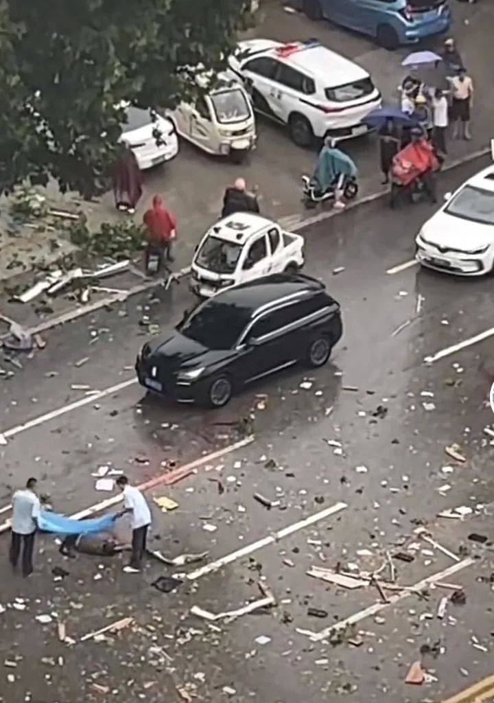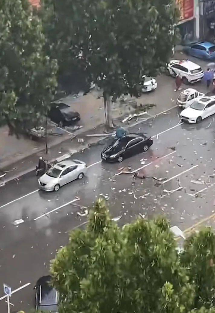 从视频中可以看到,临街的烤鱼店和银行玻璃已经全部碎裂,地面堆砌有大量砖块、桌椅等。有救援人员已经赶到现场,紧急处理此事。