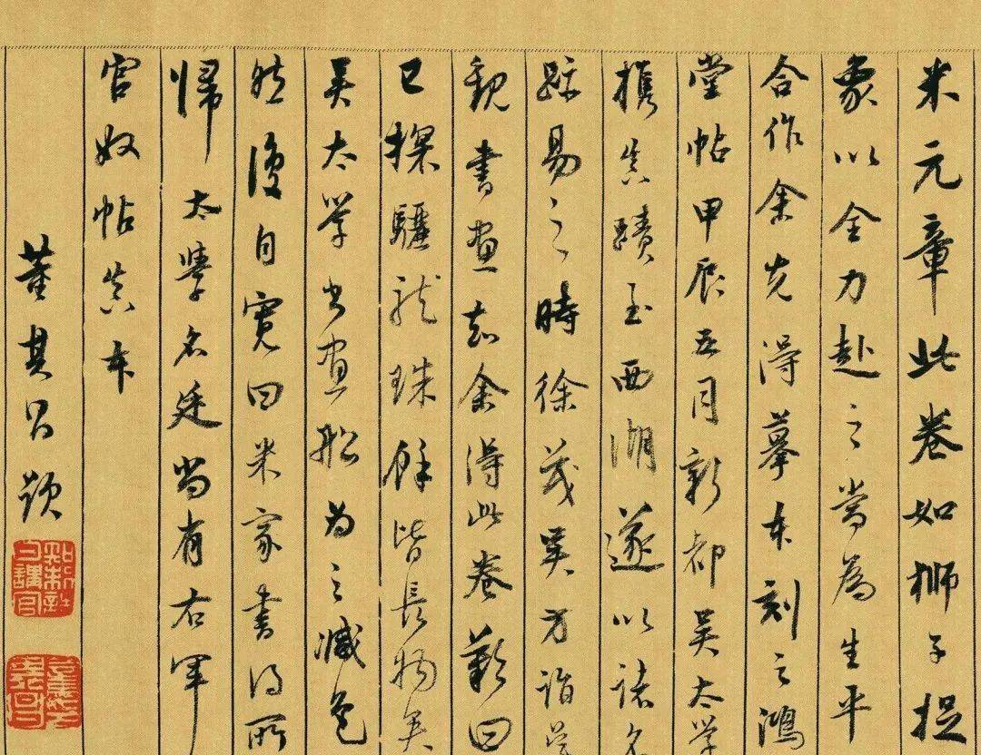 米芾在当时的书画鉴藏圈中是一个核心人物,在大量书画名迹上留下了印迹,其《书史》《宝章待访录》也对后世影响至深。董其昌对米芾鉴藏言说的引用,一方 面说明他非常在意也非常了解米芾的看法,另一方面也反映出他的学书理路和鉴藏视阈与米芾有很多交集。这既是对米芾的情结所致,又是加深这一情结的推动。