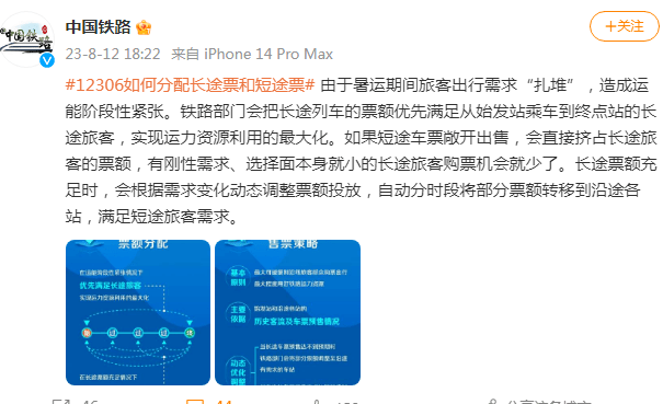 8月12日,“中国铁路”发布文章回应此事。铁路部门回应,由于暑运期间旅客出行需求“扎堆”,造成运能阶段性紧张。在这种情况下,铁路部门会把长途列车的票额,优先满足从始发站乘车到终点站的长途旅客,实现运力资源利用的最大化。