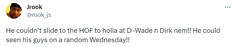 毕竟,这是韦德生涯的重要时刻。作为好兄弟,现场见证应该是自然而然的事。比如马刺的帕克和波波维奇入选名人堂,到场的不仅有吉诺比利、大卫-罗宾逊和邓肯,就连鲍文、迪奥这些马刺老将也都来了。
