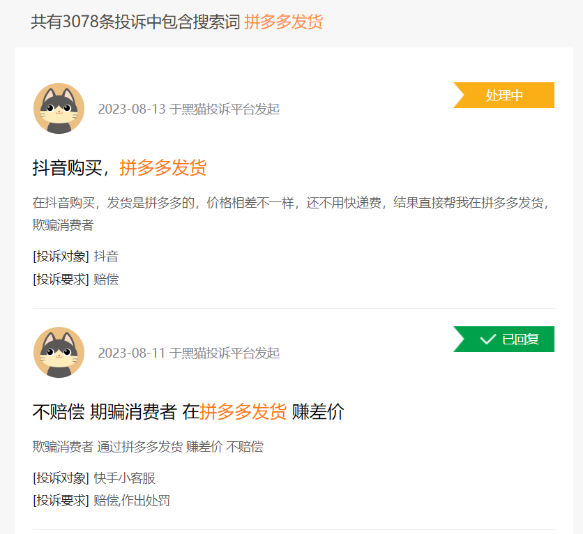 黑猫投诉平台:搜索“拼多多发货”关键词结果