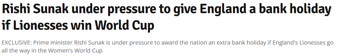 近日,澳大利亚多地表示,如果澳大利亚女足获得女足世界杯的冠军,就将开启假期模式,而且是全民休假。其中,最夸张的州要求,放假达到1周时间。而澳大利亚接下来的对手,是去年女足欧锦赛冠军英格兰女足。英格兰女足的支持者,目前坐镇唐宁街的巴基斯坦裔(妻子是印度裔)苏纳克被问及该问题。媒体预计,一旦英格兰女足夺冠,苏纳克将不得不官宣休假,而这对英格兰目前雪上加霜的经济,并不友好。