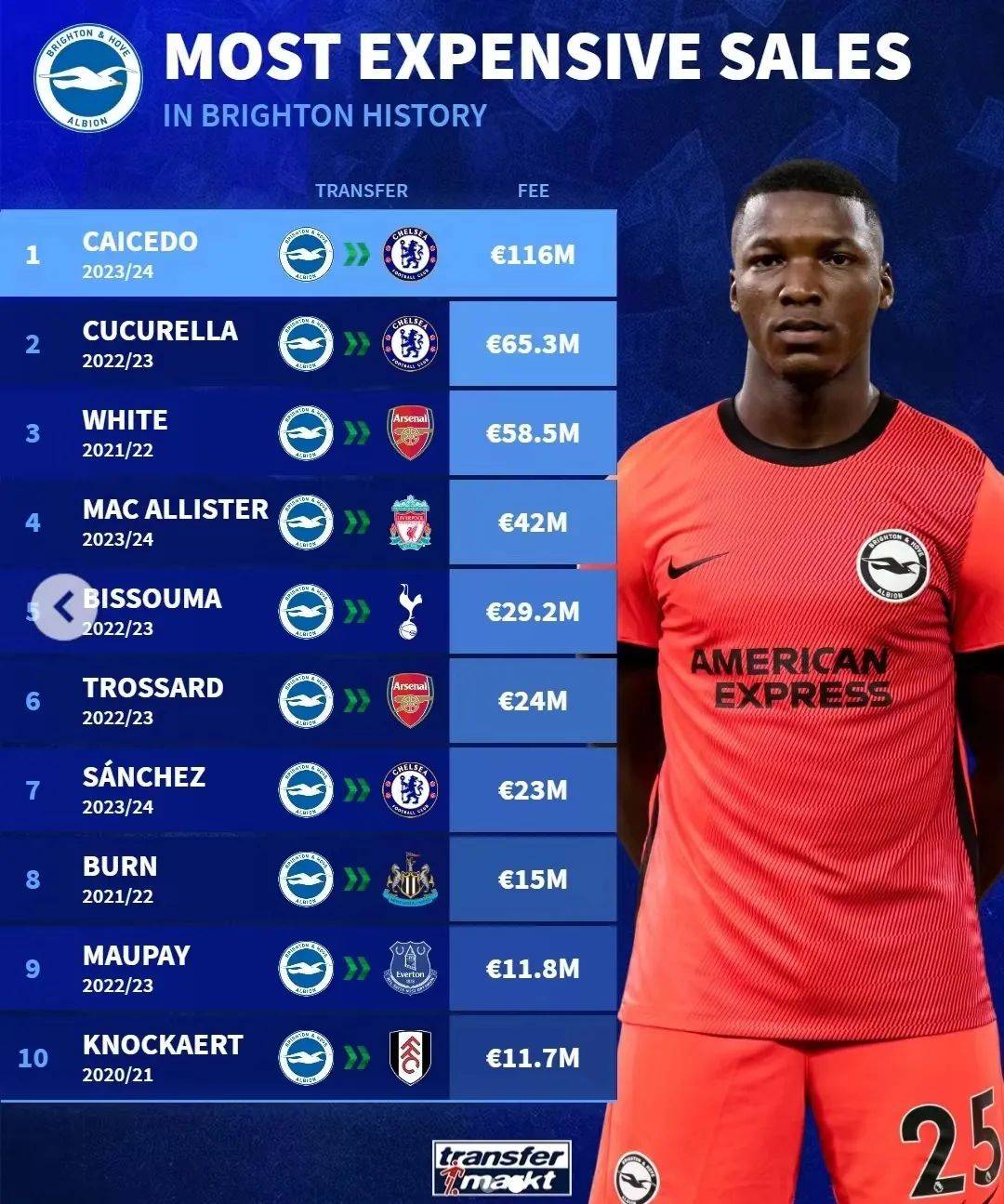 出身布莱顿青训的“零成本”门将桑切斯和后卫本·怀特,分别让切尔西掏了2300万,阿森纳掏了5850万;800万购入麦卡利斯特,4年后从利物浦净赚3400万;1800万的库库雷利亚只用1年,就净赚4730万。最夸张是凯塞多,31个月前500万欧元购入,如今至少净赚1.11亿欧元,最高可达1.28亿欧元!而且,这还没算去年切尔西强挖教练波特支付的2500万欧元违约金收入。