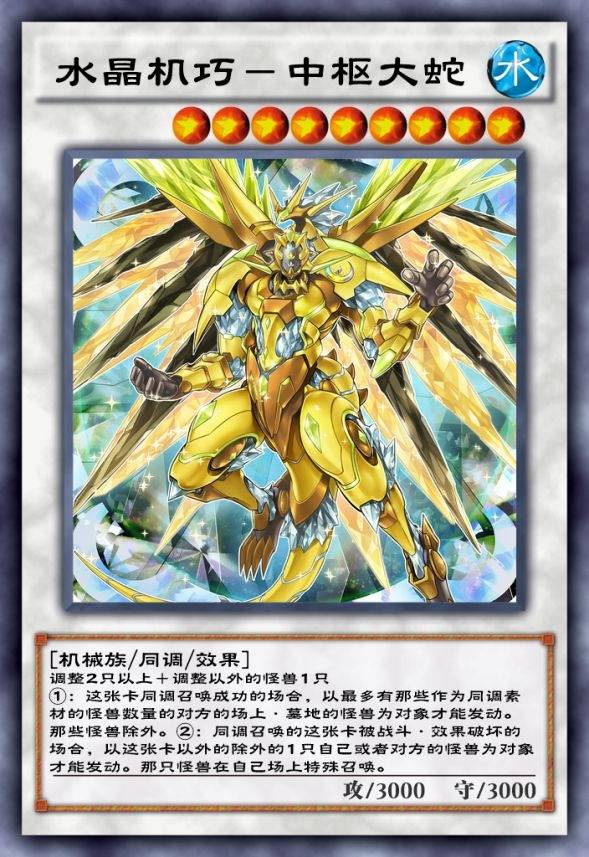 常规对局中我们需要调度双调整快速做出中枢大蛇进行站场,这张卡可以在同调召唤成功的时候根据同调素材的数量除外对手场上或者墓地的怪兽,针对一些卡牌资源一般的构筑非常好用。但是召唤难度偏高,对于一些水机展开不是很熟练的玩家来说调度还是比较困难的。