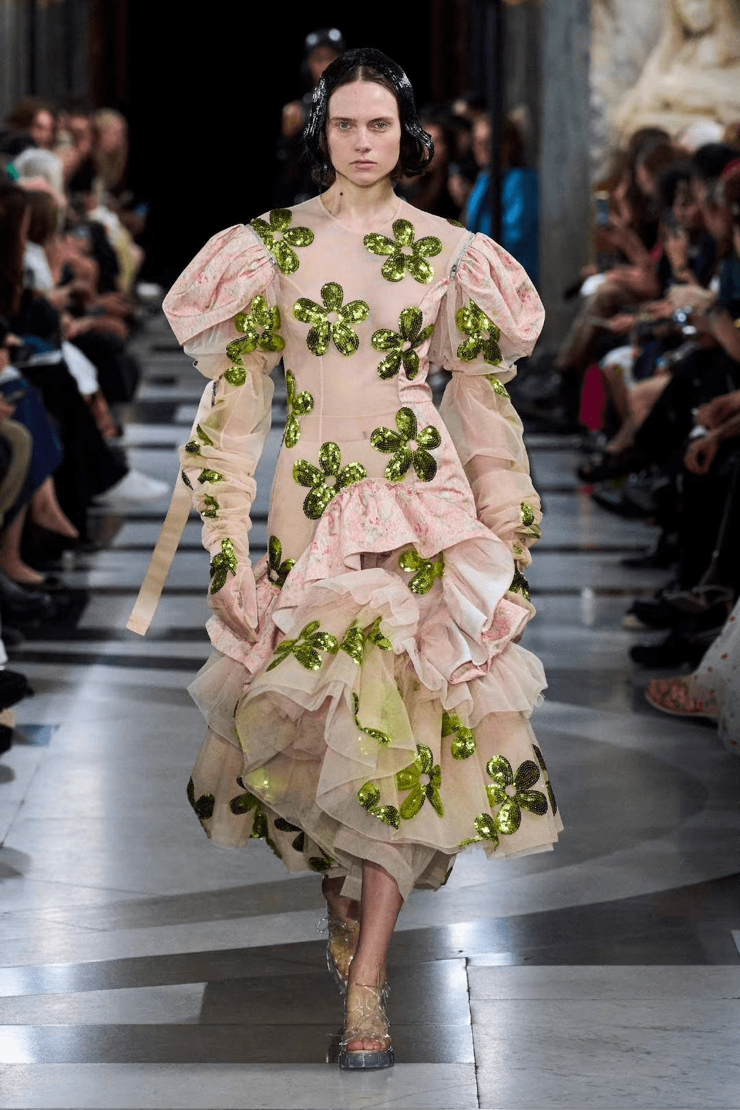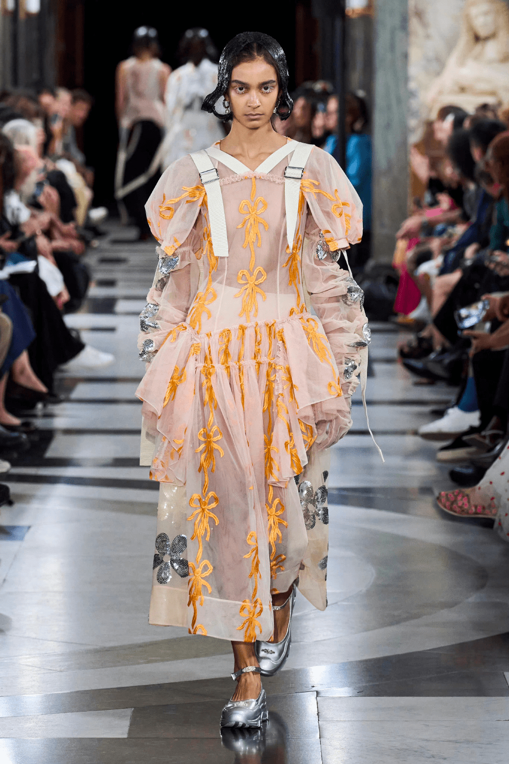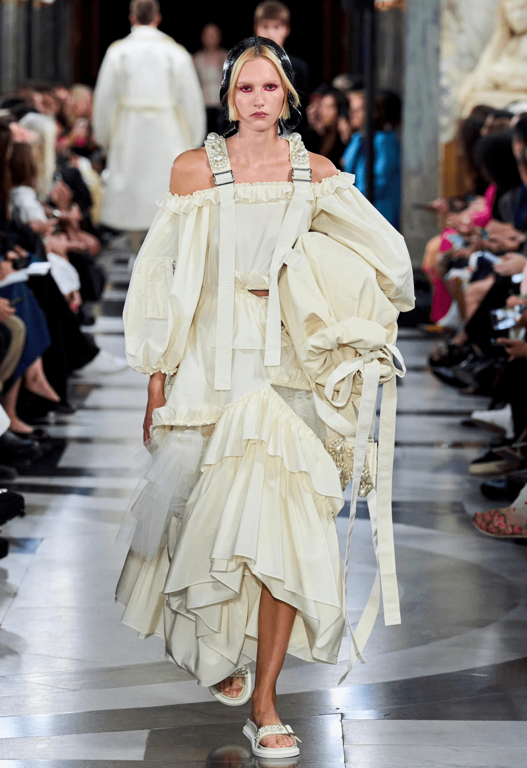 褶皱、薄纱、公主袖、蝴蝶结、珍珠包、飘带蕾丝···经典元素一个不少,依旧是那个熟悉的刚从油画里走出来的少女风设计,Simone Rocha 2023春夏系列兼具摩登、浪漫、强势的融合感,纯净的色彩,巧妙、新颖的层叠剪裁,以华丽的巴洛克风格,极致的浪漫主义,为我们勾勒出少女们叛逆又怪诞的时尚梦境!