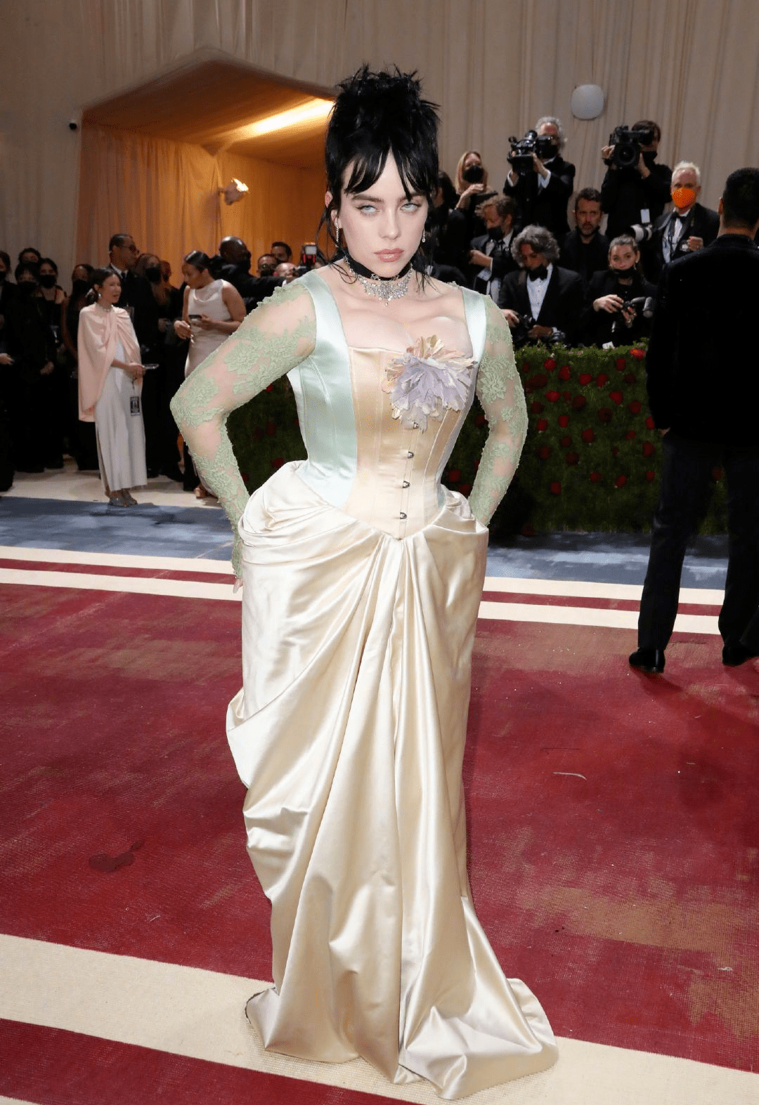 而Billie Eilish这套宫廷风的礼裙则把她的身材凸显到极致,礼服经典的束腰,凸起的臀部,让化身贵妇人的她散发出镀金时代的名姝魅力。且这套礼服的材料全部来源于回收面料,追求复古时尚的同时还兼顾了环保理念。