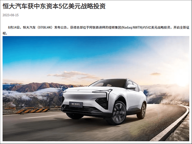 8月14日晚上,恒大汽车发布了久违的好消息,总部位于阿联酋迪拜的纽顿集团(NWTN)向恒大汽车提供5亿美元战略投资,另有6亿元人民币过渡资金在公告后5个工作日内到账。