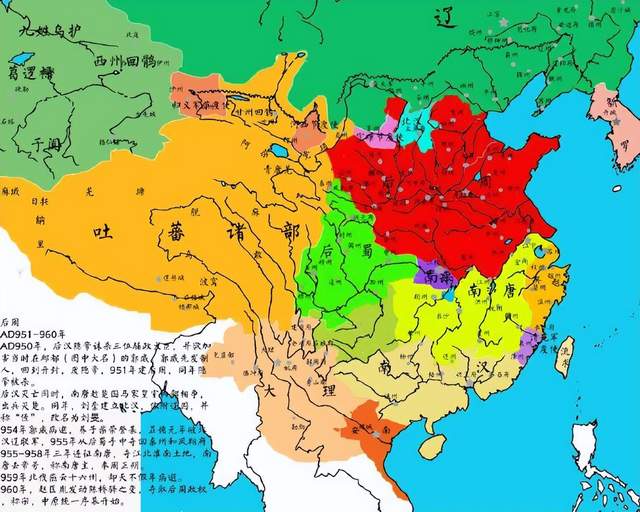 后周(951年—960年),五代十国时期中原最后一个王朝,定都东京开封府,共历三帝,享国十年。后周的疆域范围包括今河南、山东、山西南部、河北中南部、陕西中部、甘肃东部、湖北北部以及长江以北的江苏、安徽地区。虽然后周的存在时间只有10年,但是,后周的三位皇帝却都获得了善终的结局,这在五代十国时期是比较罕见的情况。