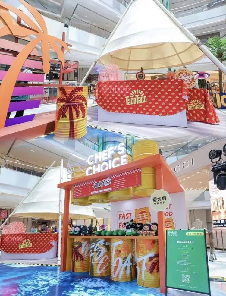 顾客蔡群英注意到,七宝万科一楼北侧的中庭,很少有空着的时候,不同营销活动带来风格迥异的精致展陈和集市,让她每次来都感到热闹新颖。眼下,中庭正举办名为“百味食趣”的快闪美食集市。