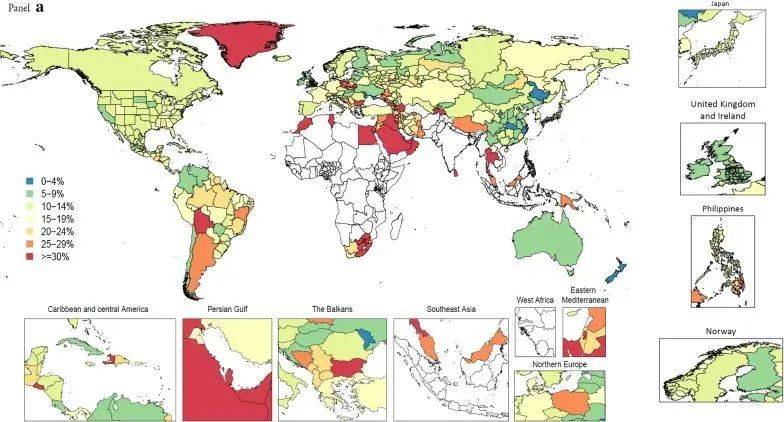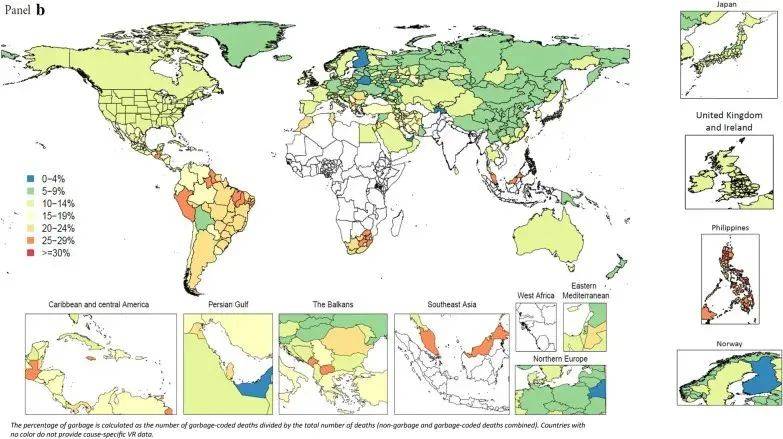 Sarah Charlotte Johnson等人对各国上报的死因数据进行了分析,结果显示,不同国家数据质量相差较大。如图所示为垃圾编码占比,蓝色为最低,即垃圾编码占全部数据的0-4%;红色为最高,即垃圾编码占全部数据的30%以上。可见,我国的编码质量在国际上处于领先地位。