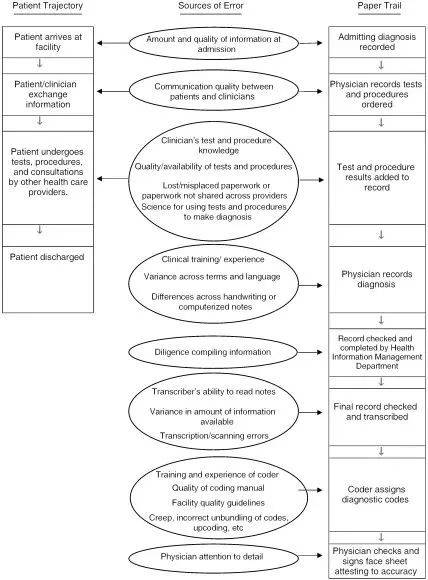 诊断的准确性取决于多种因素,例如患者的陈述、医生的知识和技术、检查设备的敏感性和特异性、疾病诊断标准的变化、病历记录的完整性以及付费政策的导向性等。因此,最终的诊断编码错误可能发生于患者入院到出院的各个环节(如图)。