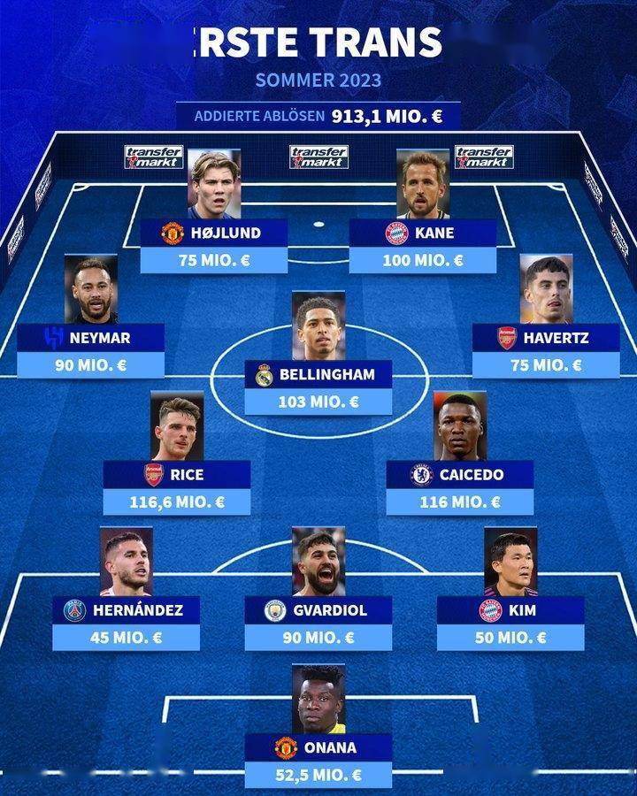 直播吧8月17日讯 德转排出了今年夏窗转会费最贵的11人,凯恩和霍伊伦搭档前锋,阵容总转会费9.13亿欧元。
