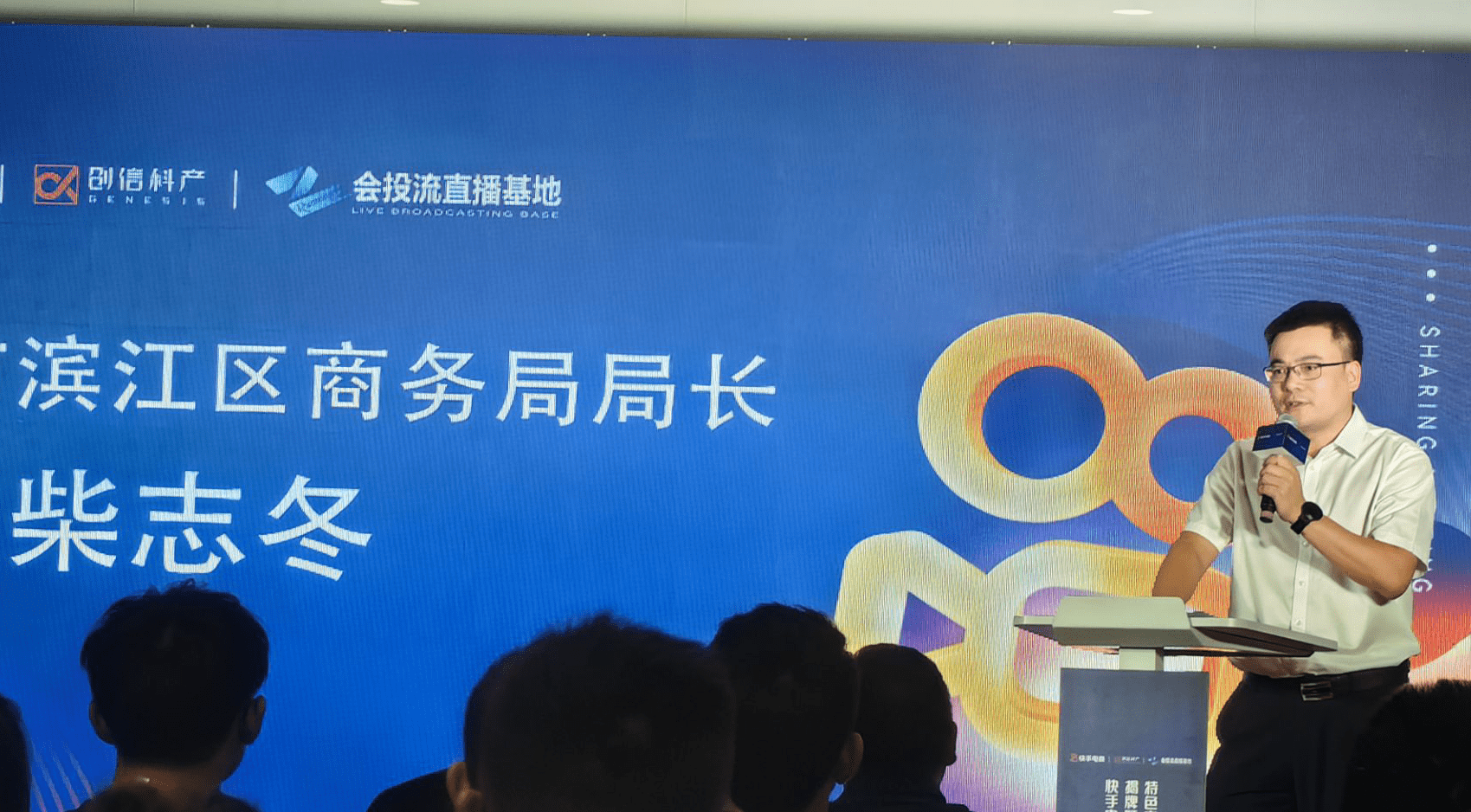 活动开始后,滨江区商务局局长柴志冬上台致辞。柴志冬表示,滨江区是国家级高新区,2022年地区生产总值达2184.8亿元,总量保持全市第三,财政总收入433.62亿元。国家高新技术企业超2200家,研发投入占GDP比重持续保持10%以上。目前,滨江区致力于打造千亿级新电商产业集群,新电商完整产业链,直播电商第一区,国货品牌集聚区。汇集了交个朋友、辛选、君盟等在内的MCN机构,电商生态发展繁荣。