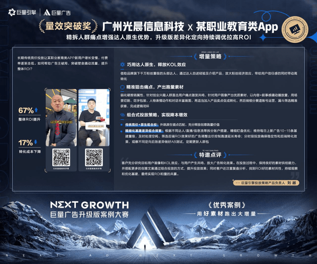 广州光晨信息科技在为某职业教育APP代理投放时,发力达人合作产出原生素材。以内容为“掌握本地生活新职业新机会”的素材为例,这样的素材紧扣当下热点,贴合KOL的定位,又将广告主的产品特点融入其中,兼备影响力和转化价值。凭借类似的素材,光晨在为该APP代理投放中实现整体ROI提升67%,转化成本下降17%。