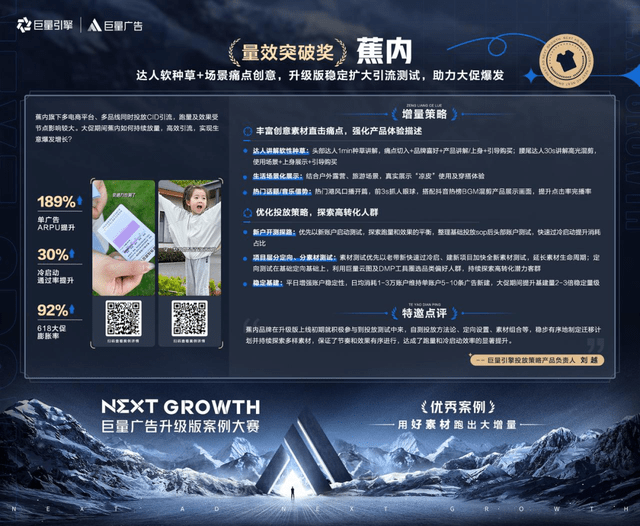 针对不同的产品,蕉内会匹配不同类型的达人和不同场景的剧情。这些广告素材没有“生硬叫卖”,而是从消费者真实的场景痛点入手,用好内容吸引用户,同时传递产品卖点。多样化的创意素材让蕉内跳出了行业挤压式投放的“内卷”,单广告ARPU提升了189%,618大促膨胀率提升了92%。