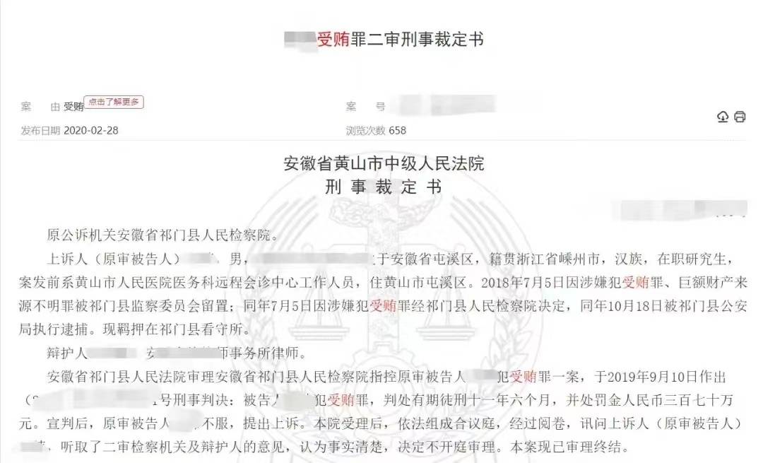 判决书显示,黄山市人民医院医务科远程会诊中心工作人员沈某,通过市医院其他国家工作人员的职务行为和个人的“统方”(药品相关处方统计数据)行为。也就是说他的收受的赃款是通过其他医生开具的处方进行统计,算出提成的。当然他这个钱是由医药公司和医药代表支付的,最后累计收受了1683.66万元。