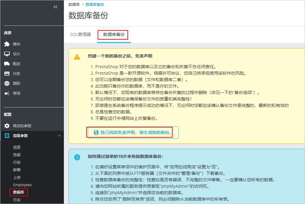 PrestaShop提供了后台数据库备份功能。