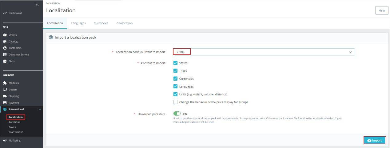 a.选择“IMPROVE > International > Localization”,选择需要导入的语言包,单击“Import”。
