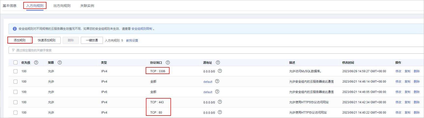 ③ 选择“安全组”页签,单击“添加规则”,添加如下规则,单击“确定”。