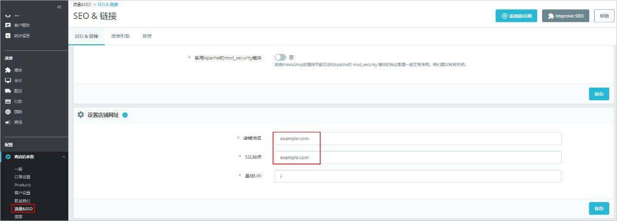 2.选择“商店的参数 > 流量&SEO”,在“设置店铺网址”配置项中设置“店铺域名”和“SSL站点”域名,和服务器域名保持一致。