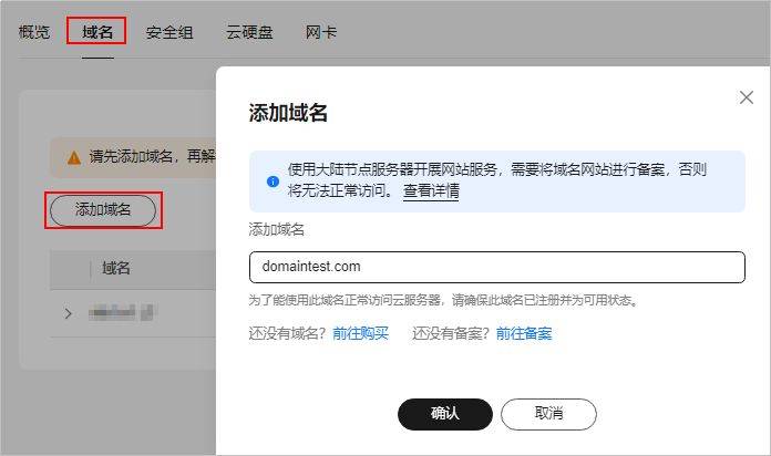 请为服务器添加并解析域名保护网站安全,并且方便您的用户访问网站。如果您仅为个人开发或测试使用,可以不添加域名。