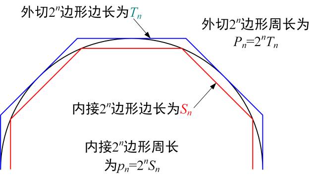 内接2n边形的边长为Sn,则其周长为pn=2n·Sn;外切2n边形的边长为Tn,则其周长为Pn=2n·Tn。