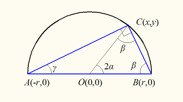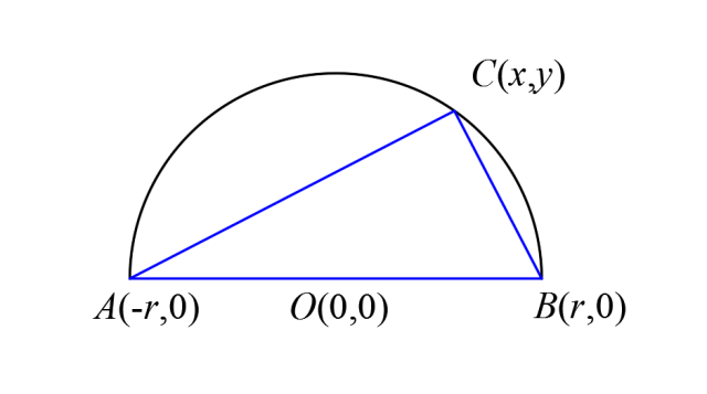 对于上图,令半径为r的半圆圆心在坐标原点,三角形的一边为半圆直径,一个顶点C在半圆的圆周上,坐标为(x,y)。
