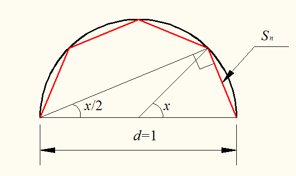 如下图所示,设内接多边形的每个边的边长为Sn,每个边对应的圆心角为x。