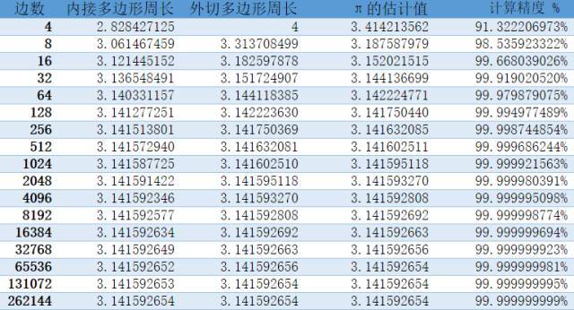 通过这样的递推公式,可以直接以内接及外切正2n边形的周长来计算内接及外切正2n+1边形的周长,成功避免了三角函数的引入。