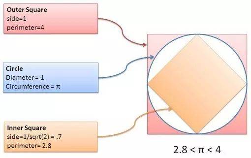 对于上图中一个已知直径为1的单位圆(其周长即为π),可以以其直径为边长作出其外切正方形,也可以以其直径为对角线作出其内接正方形。不管圆的周长是多少,其总满足大于内接正方形的周长,小于外切正方形的周长。