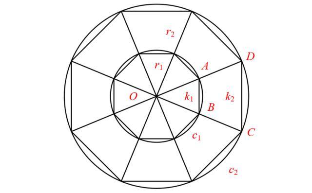 如上图所示,以点O为圆心作两个半径不同的圆,小圆的半径为r1,周长为c1;大圆的半径为r2,周长为c2。分别作两个圆的内接正n边形(n为偶数),边长分别为k1和k2,且保证正两个n边形过圆心的对角线重合。