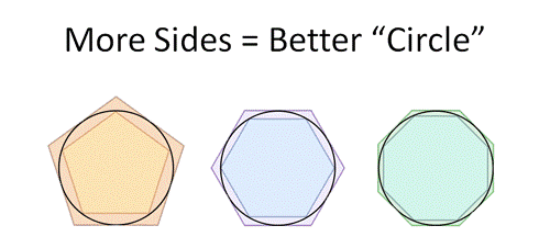 假设现在π的大小未知,我们只能肯定π在2.8到4之间,先取个中间值作为π的估计值,约等于3.4。我们发现这样精度很低,因为用4边形来估算实在是太“粗糙”了,为了提高这种方法的精度,可以用边数更多的正多边形来逼近。