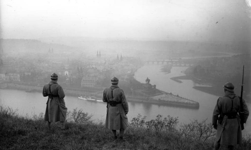 就这还不算完,协约国为了防止德国日后复仇,还特意划出了一个莱茵非军事区。什么叫作莱茵河非军事区?说简单点就是,莱茵河以东五十公里是不设防地段,德军要活动也得在这个非军事区之外,莱茵河以西就是协约国的军队,甚至还占据了莱茵河东岸的桥头堡和桥梁。